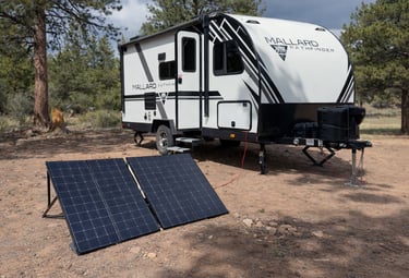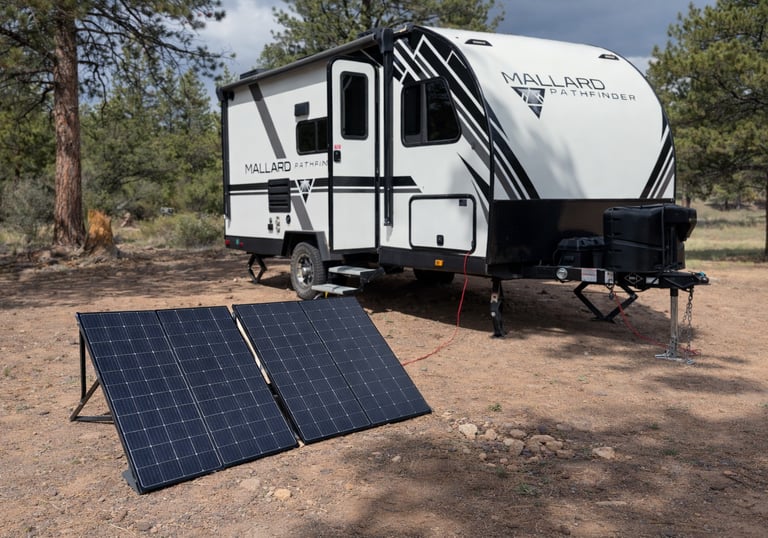 The portable panel can be positioned in the sun while the trailer remains comfortably parked in the shade, improving charging performance during off-grid camping.